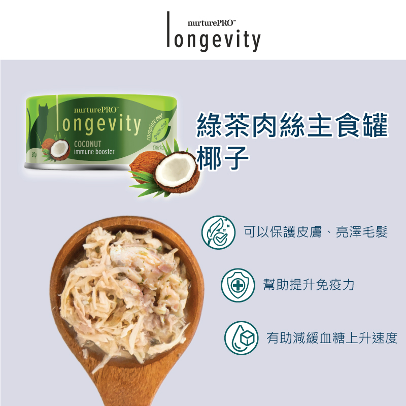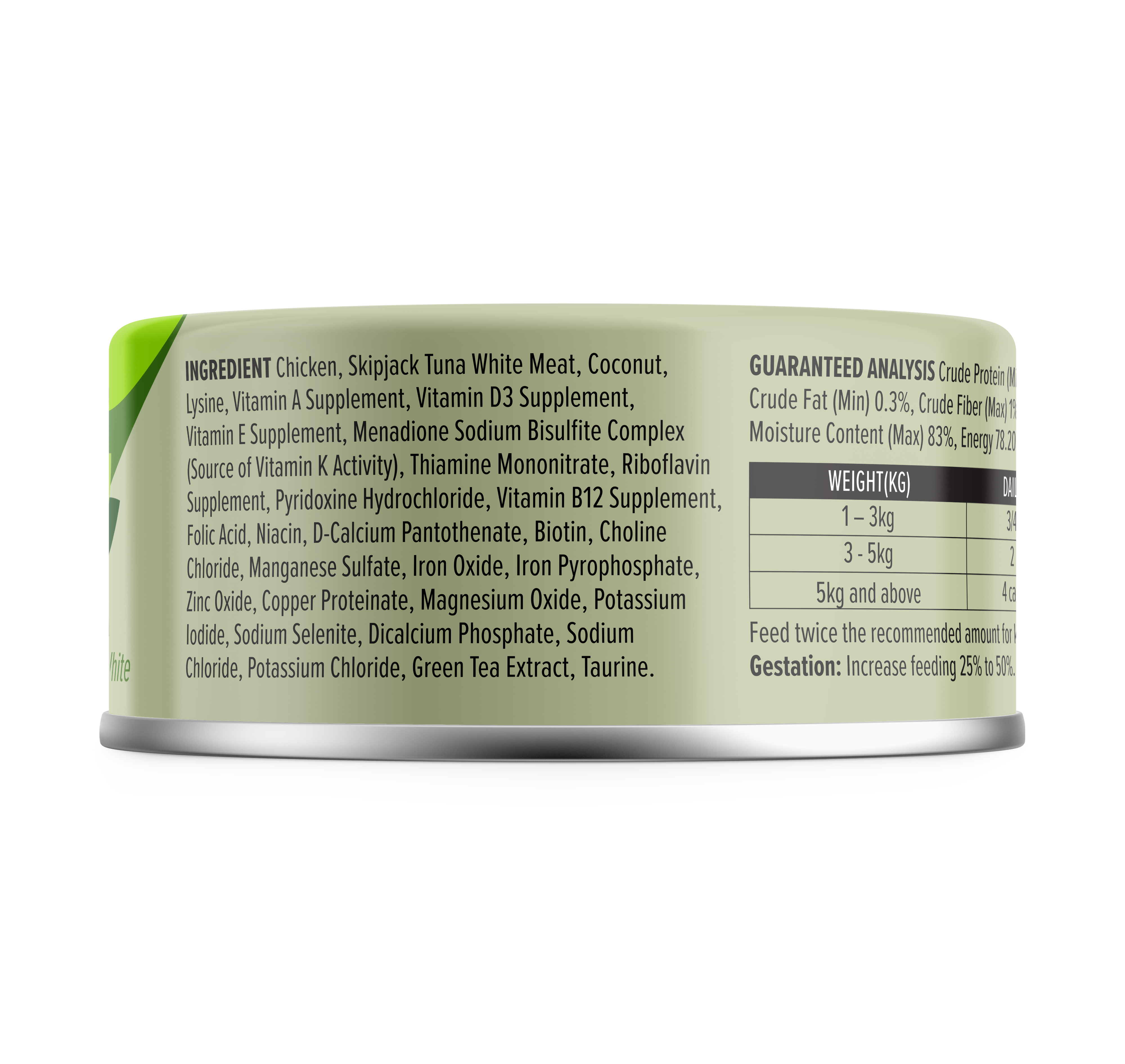 雞肉,白吞拿魚,椰子,離胺酸,維生素A補充劑,維生素D3補充劑,維生素E補充劑,甲萘醌亞硫酸鈉複合物,硝酸硫胺明,核黃素補充劑,鹽酸吡哆醇,維生素B12補充劑,葉酸,菸酸,D-鈣泛酸,生物素,氯化膽鹼,硫酸錳,氧化鐵,焦磷酸鐵,氧化鋅,蛋白質銅,氧化鎂,碘化鉀,亞硒酸鈉,磷酸氫鈣,氯化鈉,氯化鉀,綠茶提取物,牛磺酸。